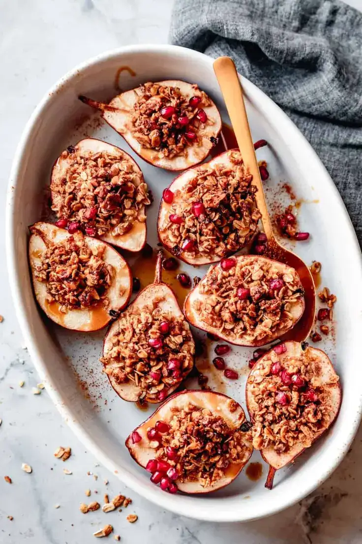 Why You’ll Love It ~ Baked pears topped with crispy oats, walnuts, brown sugar, and a cinnamon butter crumble, serve it with a dollop of ice cream. Warm, cozy, and irresistibly sweet!