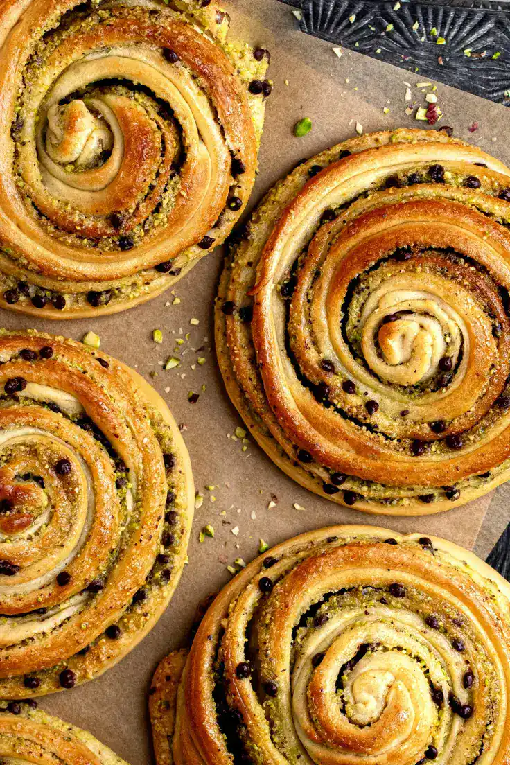 Why You’ll Love It ~ Pillowy soft rolls swirled with sweet pistachio filling and dotted with mini chocolate chips. A cozy, chocolatey twist on classic swirls!