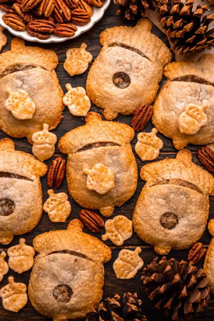 Why You’ll Love It ~ Tiny acorn-shaped pies with buttery crusts and gooey pecan filling, and sprinkled witb sugar. Sweet, nutty bites you’ll want more of!