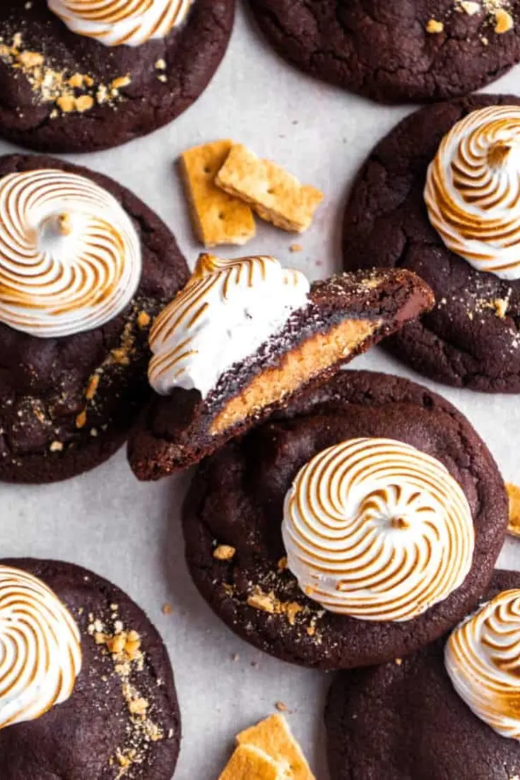 Why It’s Great ~ Rich double chocolate cookies are filled with creamy graham cracker cookie butter and topped with fluffy, torched vanilla bean marshmallow fluff. Gooey, chocolatey, and perfect for any cookie lover!